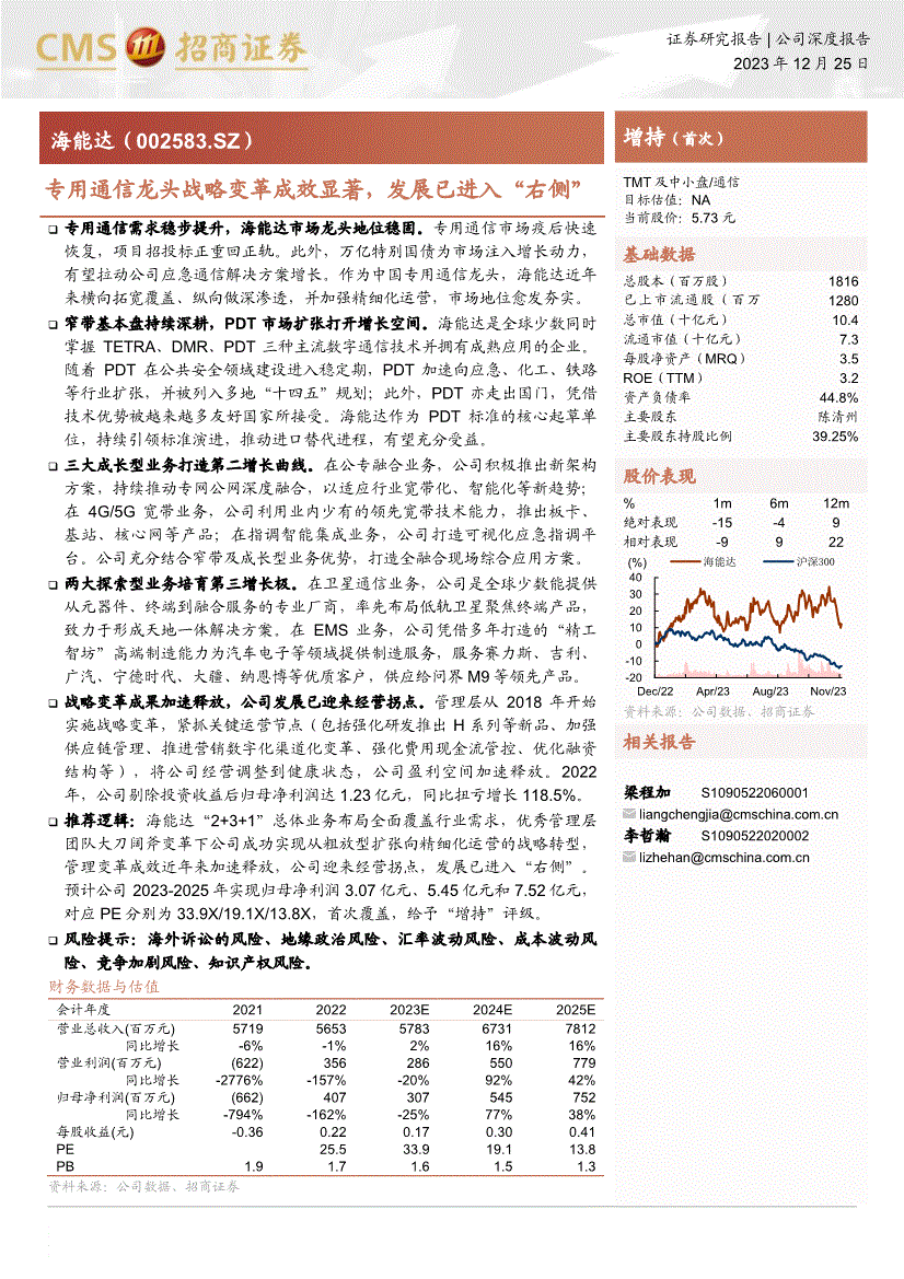 证券研究报告公司深度报告2023年12月25日增持(首次) 专用通信龙头战略变革成效显著,发展已进入“右侧” TMT及中小盘/通信目标估值:NA 当前股价:5.73元专用通信需求稳步提升,海能达市场龙头地位稳固。