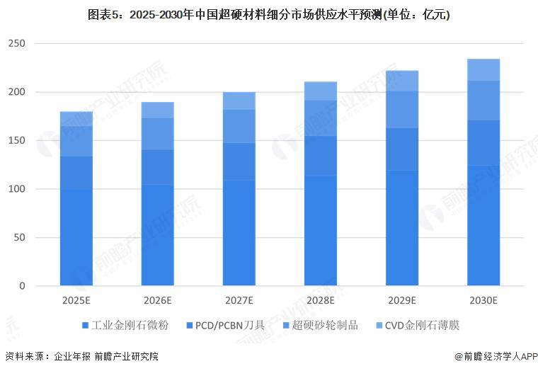 2025-2030年间,中国超硬材料细分市场整体呈稳步增长态势,各产品板块表现出不同的增长动能。其中,工业金刚石微粉作为基础材料,占据最大市场份额,年均增速保持在4%-5%左右,体现出稳定的基础需求;PCD/PCBN刀具增长势头较快,受益于高端制造与航空航天加工需求的带动,年均增长率超过6%。而超硬砂轮制品作为磨削耗材,受下游精密加工行业带动,维持5%左右增速。CVD金刚石薄膜则表现出最强增长潜力,广泛应用于半导体、光电和医疗等高附加值领域,预计年均增速接近8%,展现出由功能性材料拉动的新增长动能。整体上,产业结构正从以传统微粉为主,逐步向高性能刀具与薄膜材料等高附加值领域升级。